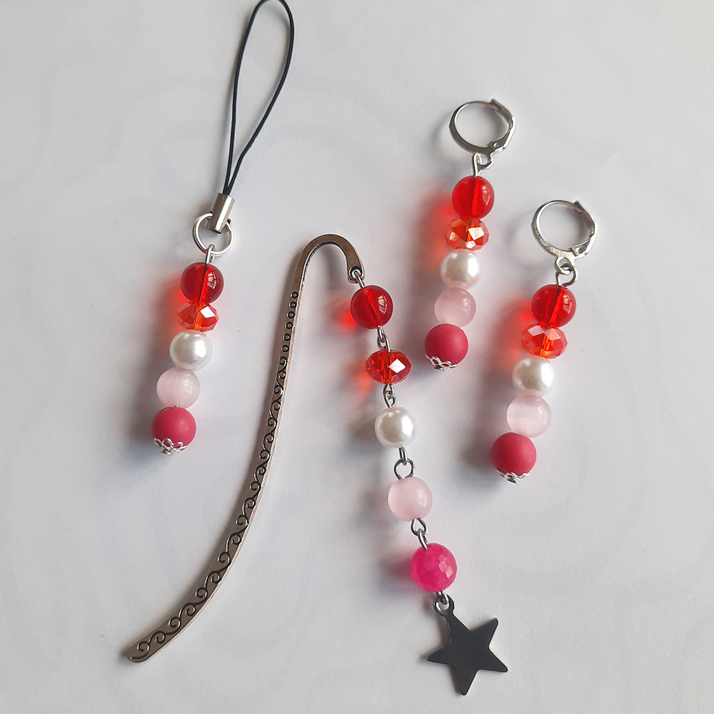 Modèles disponibles : monoboucle, paire de boucles d'oreilles, marque-page et bijou de téléphone.