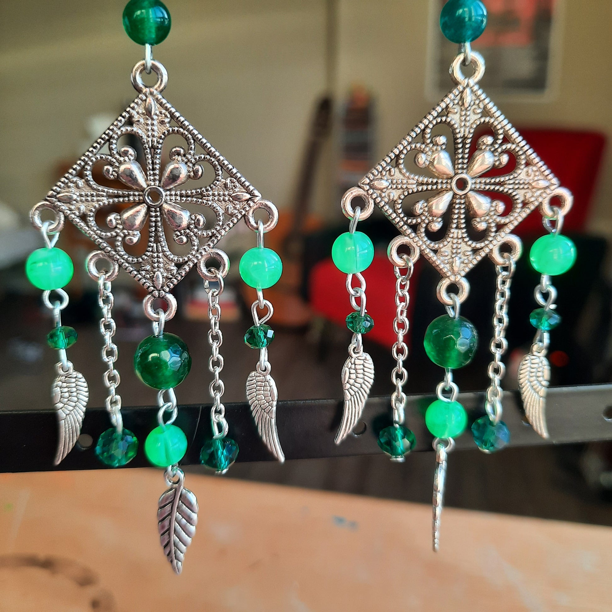 Découvrez les boucles d'oreilles "Green Velvet", une création unique mêlant l'élégance gothique à l'esthétique art déco.