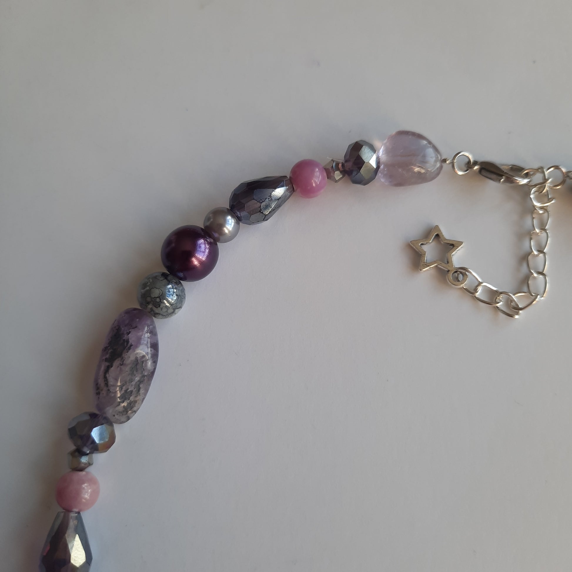 Verre, acrylique, perles effet améthyste...le jeu de matières et de couleurs impose le style du bijou et l'audace nécessaire pour le porter avec classe. Au centre, un pendentif coeur ainsi que des spirales et des étoiles en acier racontent l'histoire d'une déclaration d'amour.