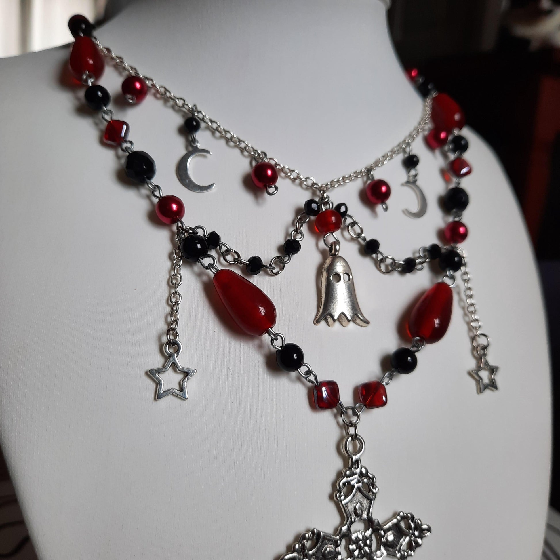 Collier gothique de perles bordeaux, rouges et noirs avec pendentifs croix, fantôme, étoile et petites lunes en acier. Exemplaire unique assemblé par mes soins à partir de matériaux de seconde-main (excepté la croix), il mesure entre 39 et 44cm selon le cran utilisé et la longueur peut-être modifiée dans les options de personnalisation ou en me contactant.