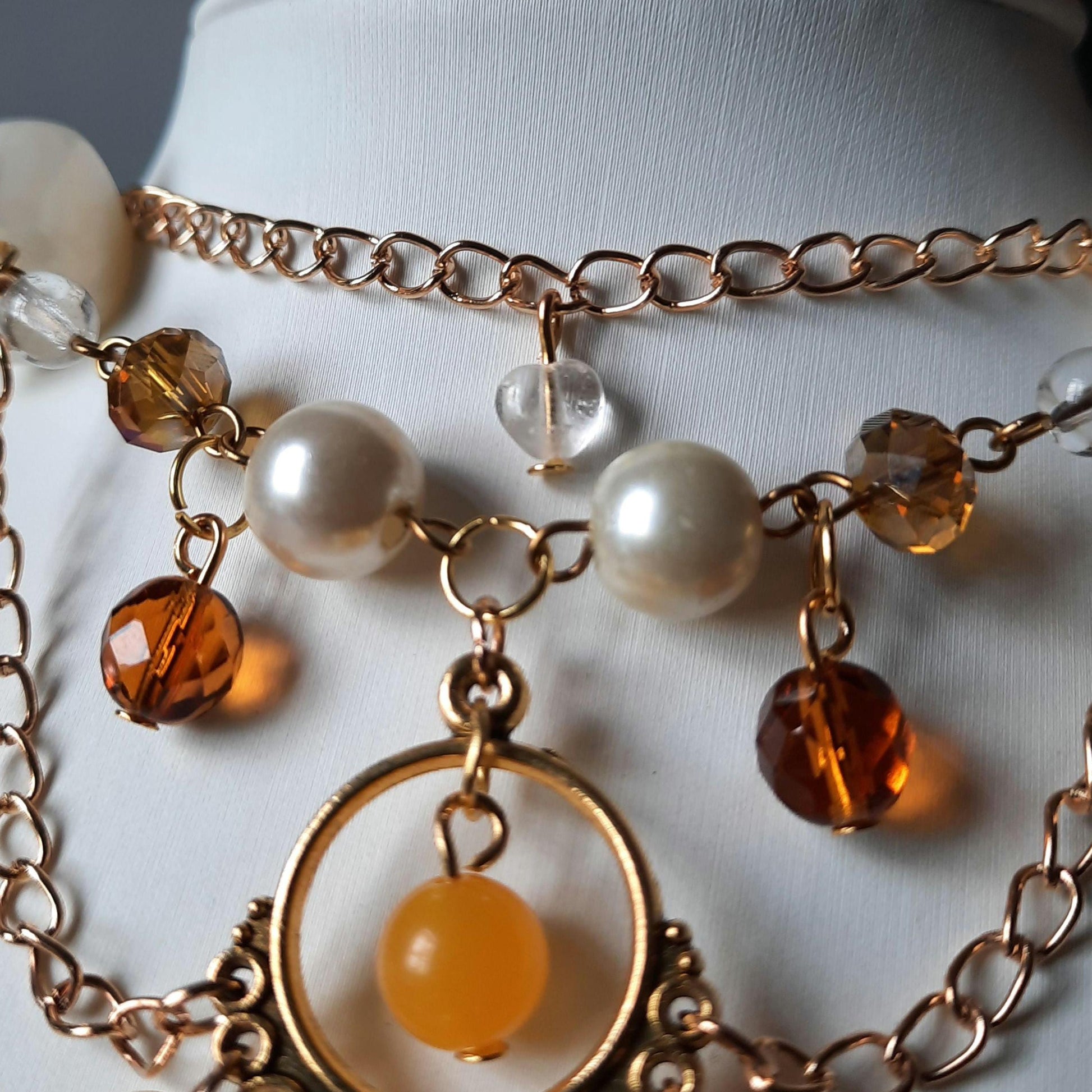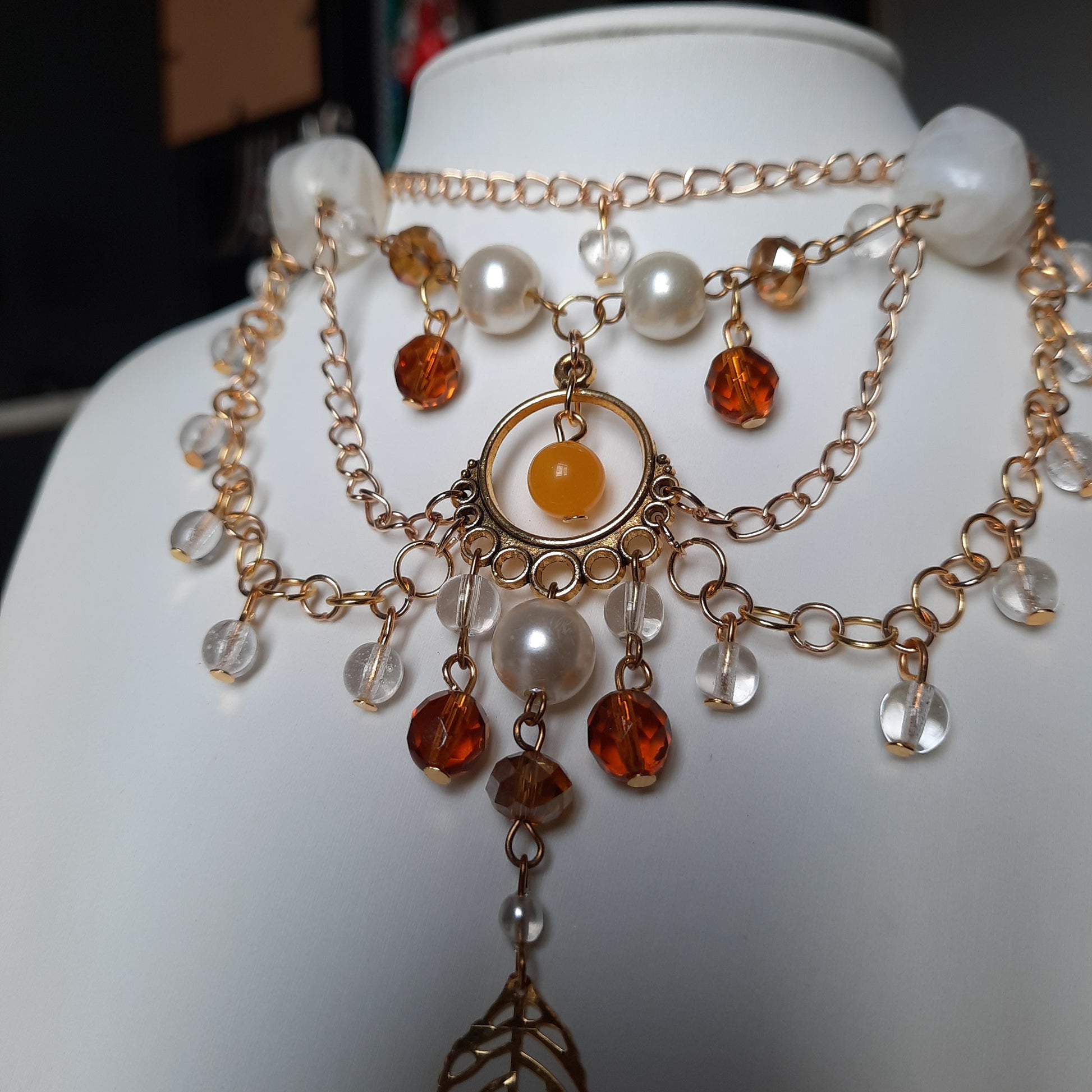Ce collier unique combine l’éclat du doré, la douceur du verre et un design maximaliste qui attire le regard. Des perles de verre transparentes, jaunes et ambrées sont soigneusement assemblées pour créer un jeu de lumière et de reflets subtils. Un pendentif en forme de feuille dorée apporte une touche organique et élégante.