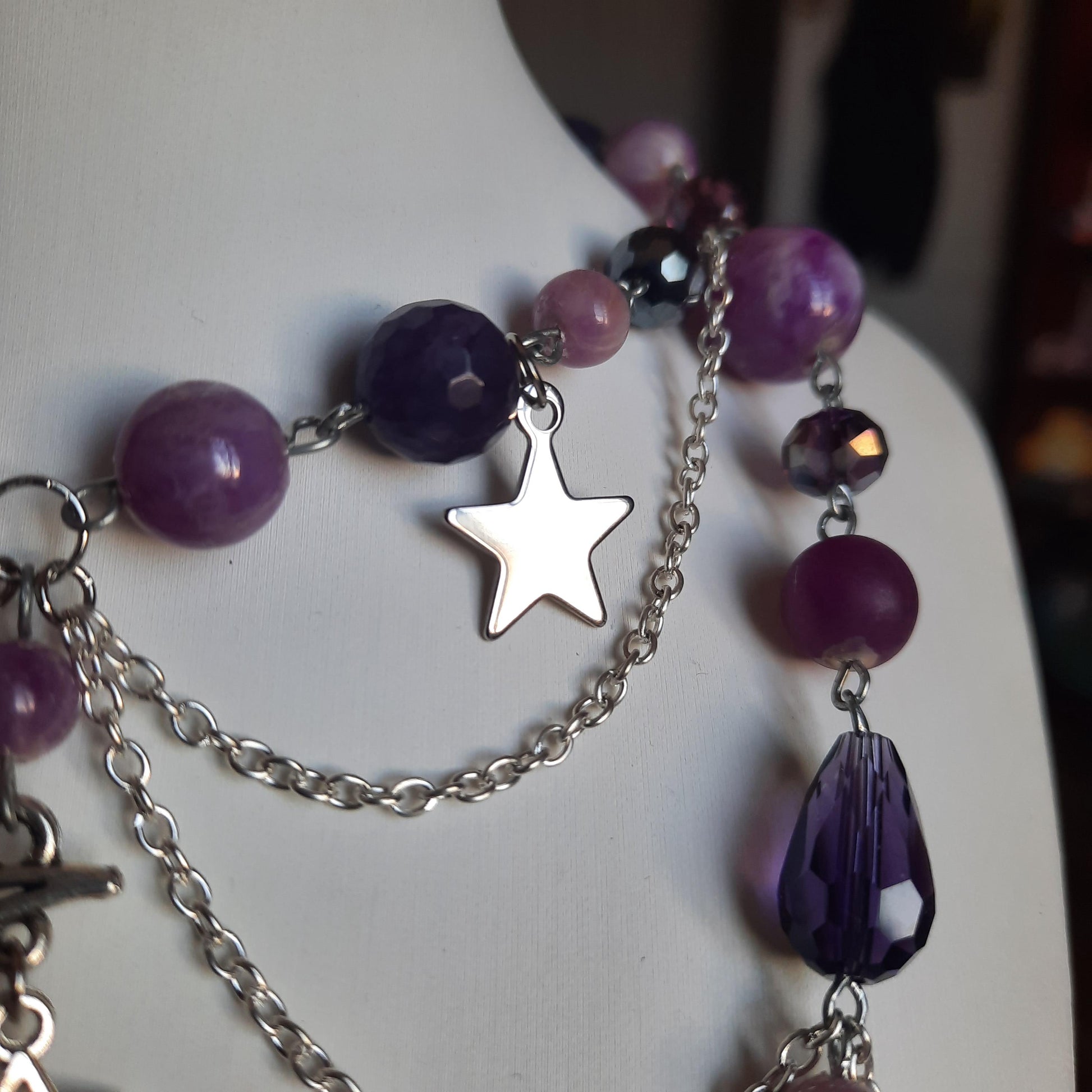 Affirme ton style avec "Lune Violette", un collier artisanal aux accents fantaisies et maximalistes, conçu à partir de matériaux de récupération soigneusement choisis.