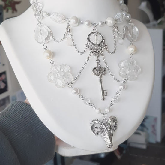 Ce collier unique combine l’éclat du blanc la douceur du verre et un design maximaliste qui attire le regard. Des perles de verre transparentes sont soigneusement assemblées pour créer un jeu de lumière et de reflets subtils. Les pendentifs en forme de clé, de bouc et d'étoile apportent une touche de mystère et de secret.