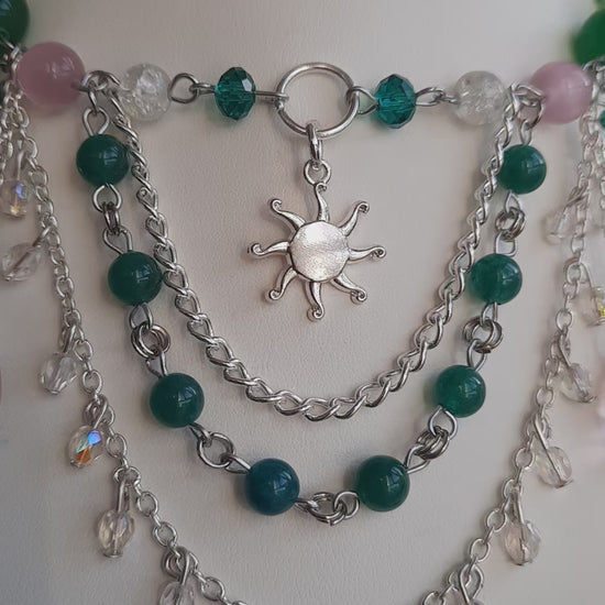 Ce collier unique combine l’éclat du vert, la douceur du verre et un design maximaliste qui attire le regard. Des perles de verre transparentes sont soigneusement assemblées pour créer un jeu de lumière et de reflets subtils. Les pendentifs tête de mort en plus du pendentif principal donnent au collier une esthétique sinistre, sombre et pleine de mystères.