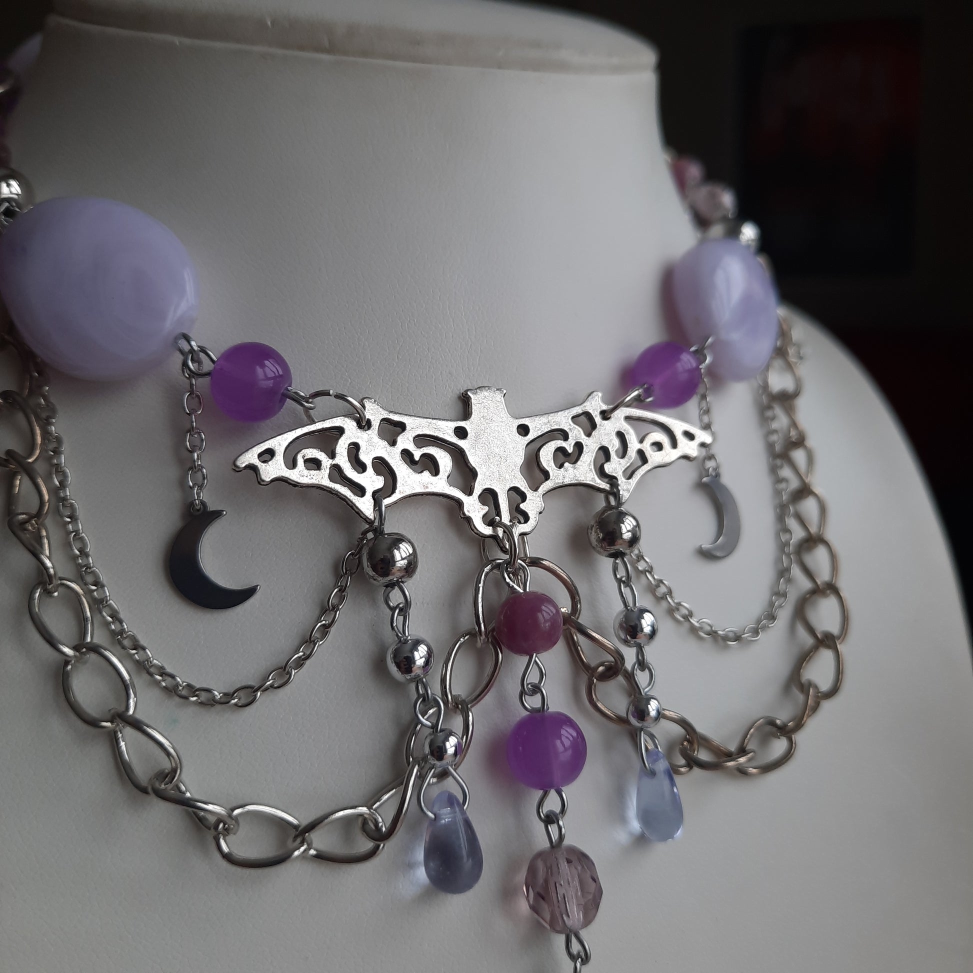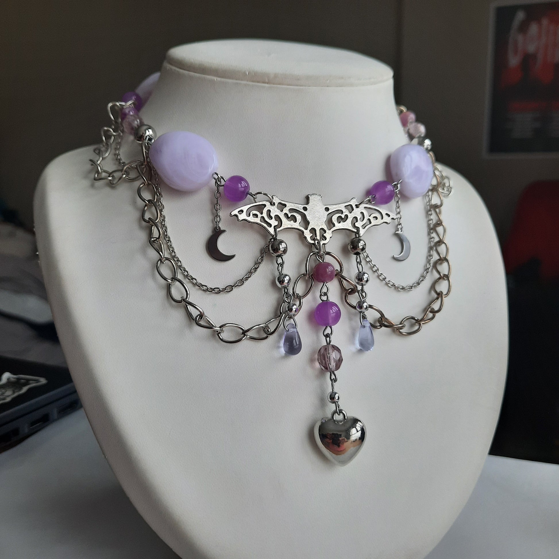 Gothique, coloré, irrésistiblement original — le collier "Sweet Bat" est une pièce unique. Sa palette violet pâle et argentée assure la douceur et la beauté de ce collier.
