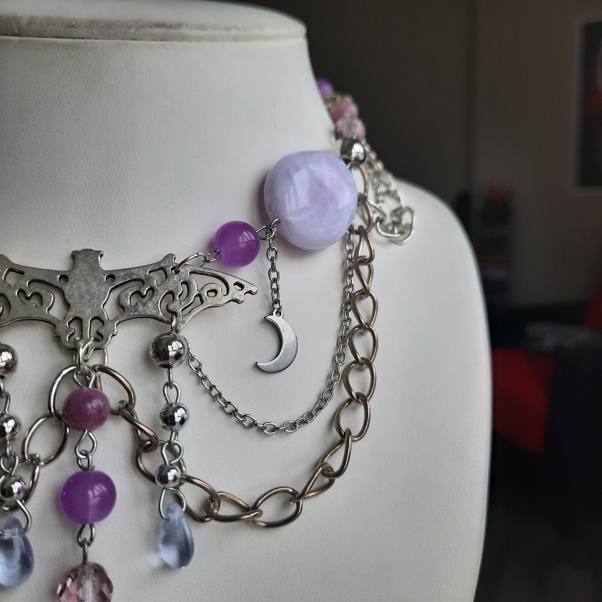 Ce collier unique combine l’éclat du verre, la douceur de l'acrylique et un design maximaliste qui attire le regard. Les différents pendentifs sur le thème de la nuit, en plus du pendentif principal chauve-souris raconte l'histoire du collier sans éclipser les différentes chaînes et perles en verre composant le bijou. Inspiré du style pastel goth tout en restant maximaliste et élégant, ce collier est une véritable déclaration alternative.